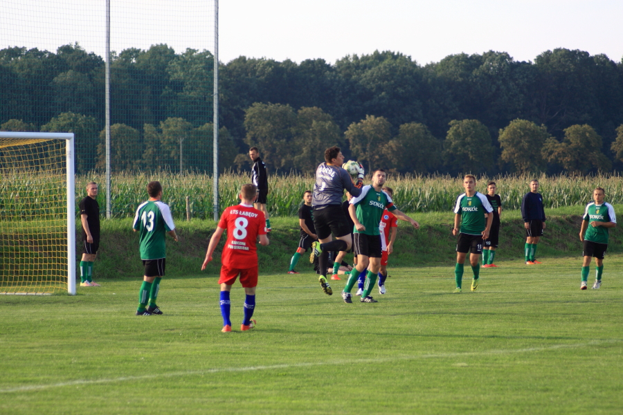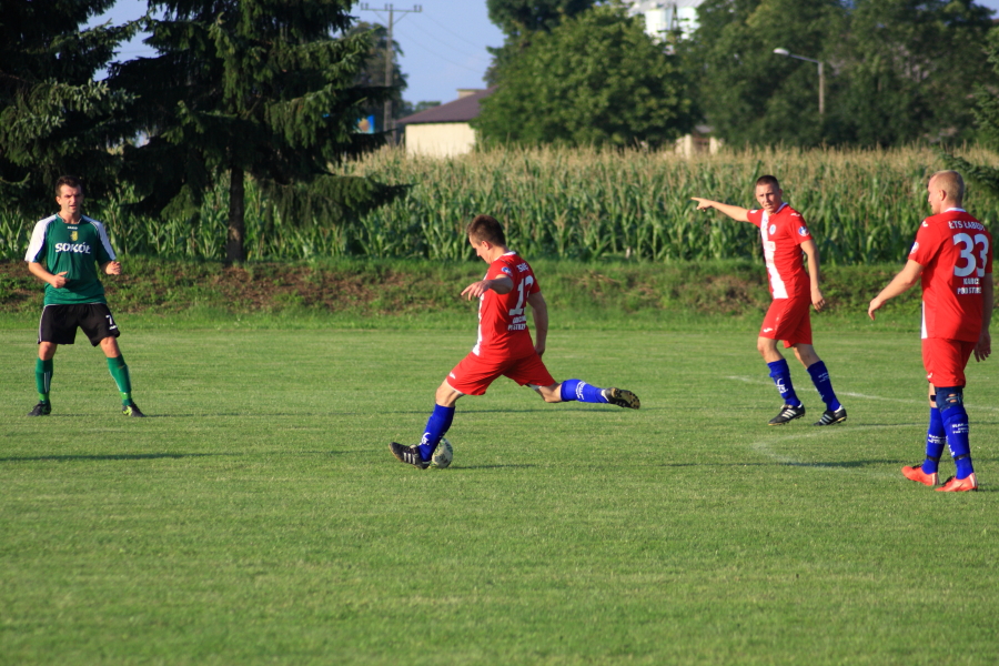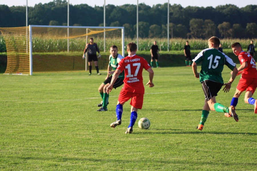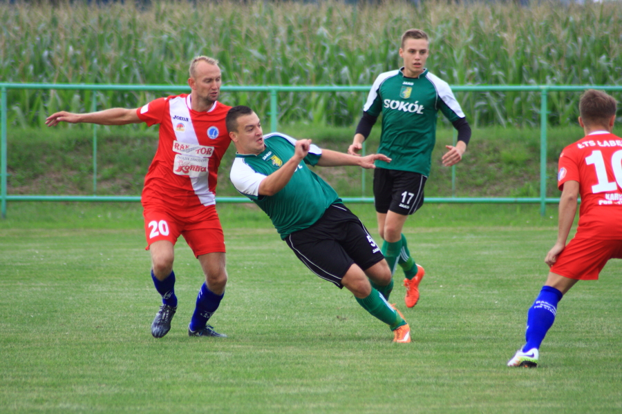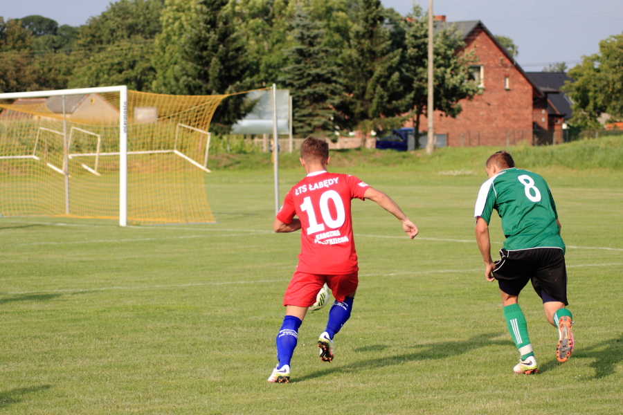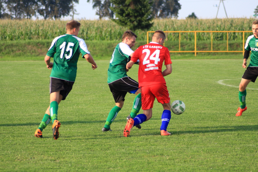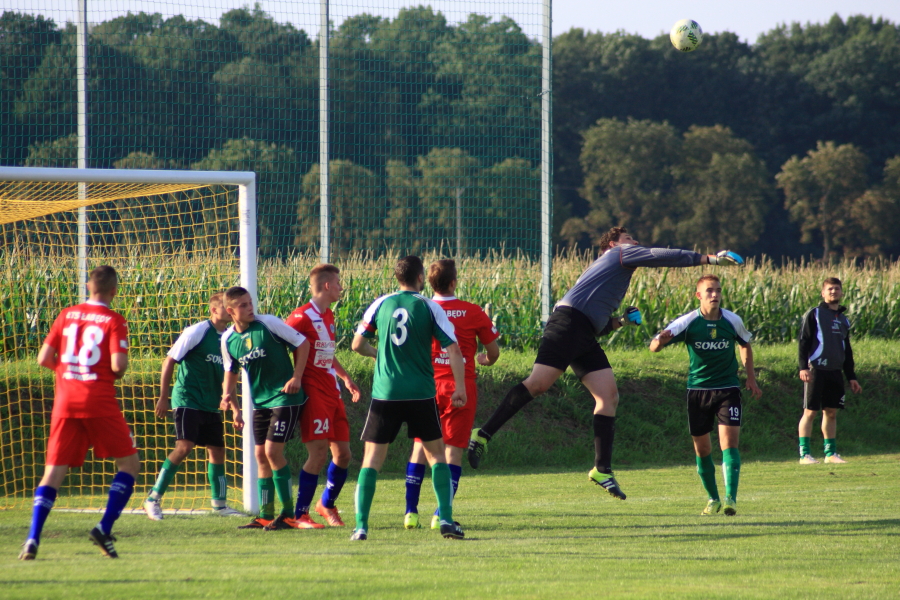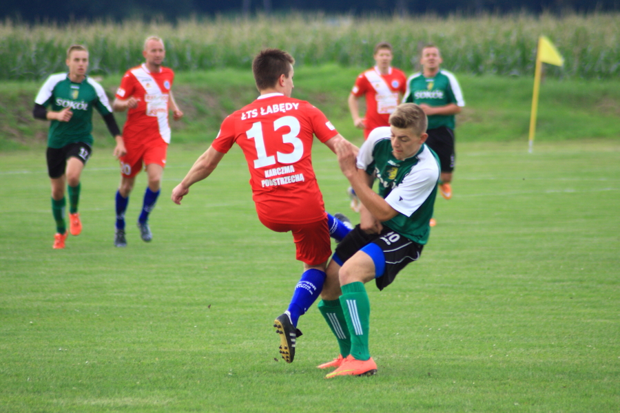 Swój pierwszy mecz łabędzianie rozegrali na wyjeździe w Łanach Wielkich. Naszym przeciwnikiem był miejscowy Sokół, który w ubiegłym sezonie wywalczył awans z A klasy. Pierwsza połowa meczu przebiegała pod dyktando ŁTS, który od pierwszej minuty kontrolował piłkę. Im bliżej gwizdka na przerwę tym coraz więcej sytuacji podbramkowych mieli łabędzianie – niestety każda niecelna. Ogólnie piłkarze ŁTS kilkukrotnie strzelali z daleka, ale bramkarz gospodarzy okazał się być murem nie do przejścia. W 30 minucie piłkarz gospodarzy Mrożek uderzył piłkę mocno w stronę bramki Kasprzika, ale Kapel wybił piłkę ponad poprzeczką na rzut rożny. Była to właściwie jedyna sytuacja w pierwszej połowie ze strony gospodarzy, która mogła zagrozić bramce łabędzian.