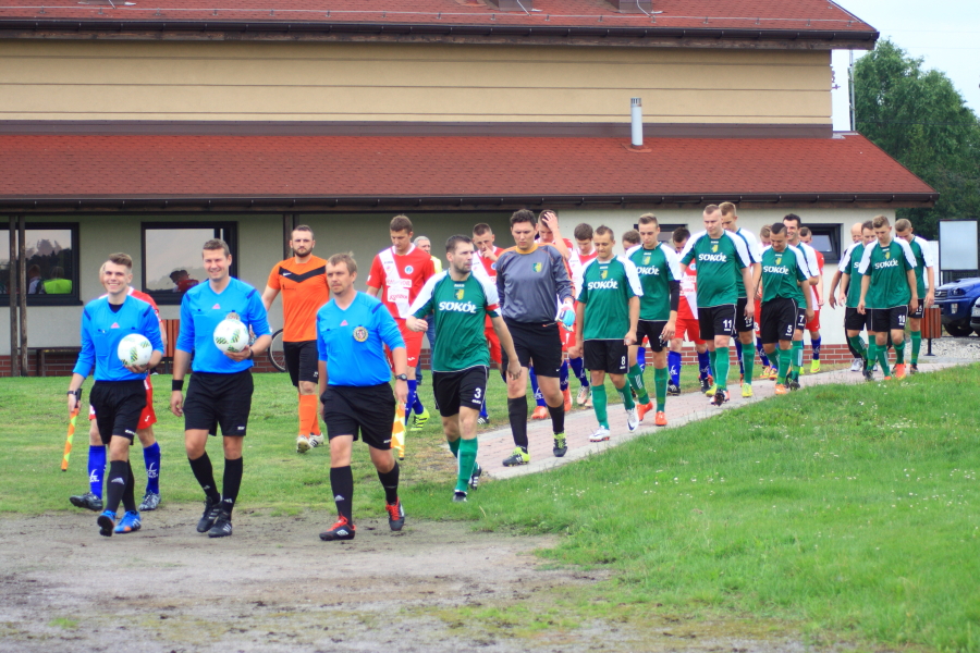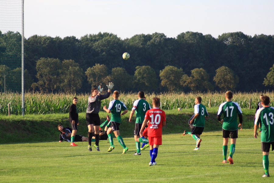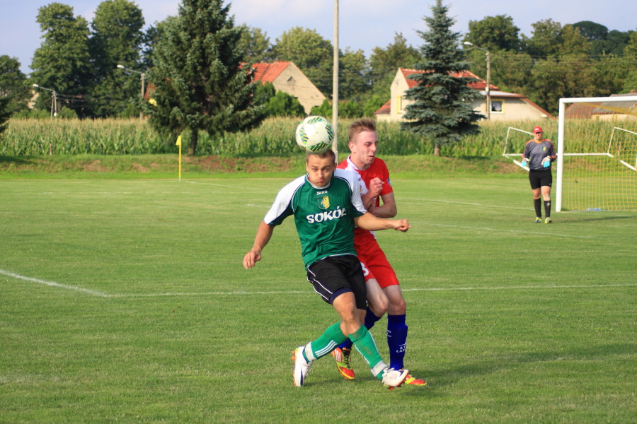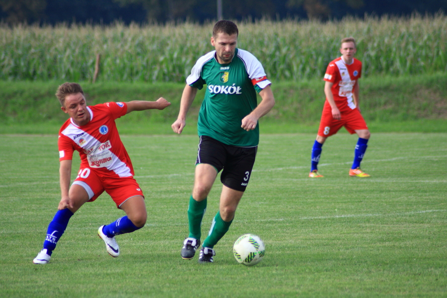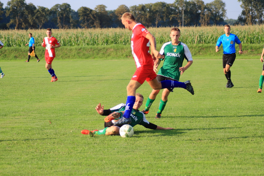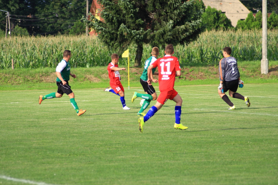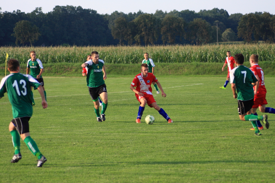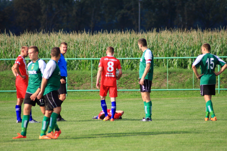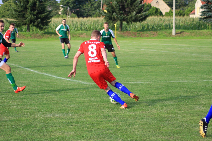 Swój pierwszy mecz łabędzianie rozegrali na wyjeździe w Łanach Wielkich. Naszym przeciwnikiem był miejscowy Sokół, który w ubiegłym sezonie wywalczył awans z A klasy. Pierwsza połowa meczu przebiegała pod dyktando ŁTS, który od pierwszej minuty kontrolował piłkę. Im bliżej gwizdka na przerwę tym coraz więcej sytuacji podbramkowych mieli łabędzianie – niestety każda niecelna. Ogólnie piłkarze ŁTS kilkukrotnie strzelali z daleka, ale bramkarz gospodarzy okazał się być murem nie do przejścia. W 30 minucie piłkarz gospodarzy Mrożek uderzył piłkę mocno w stronę bramki Kasprzika, ale Kapel wybił piłkę ponad poprzeczką na rzut rożny. Była to właściwie jedyna sytuacja w pierwszej połowie ze strony gospodarzy, która mogła zagrozić bramce łabędzian.