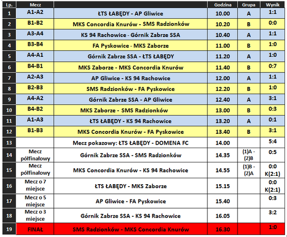 Drużyny zostały podzielone na dwie grupy. W grupie A znalazły się: ŁTS Łabedy, AP Gliwice, KS 94 Rachowice, Górnik Zabrze. W grupie B: Concordia Knurów, Ruch Radzionków, FA Pyskowice, Zaborze Zabrze. W pierwszym meczu półfinałowym spotkały się drużyny z Radzionkowa oraz Zabrza (Górnik), górą w tym spotkaniu okazały się ''młode'' Cidry, które rozgromiły Górnika aż 5:0!. W drugim spotkaniu półfinałowym Concordia Knurów mierzyła się z KS 94 Rachowice. Po 15 minutach wynik był nie rozstrzygnięty i potrzebne były rzuty karne, w których lepsi okazali się młodzi zawodnicy Concordii, wygrywając 2:1.