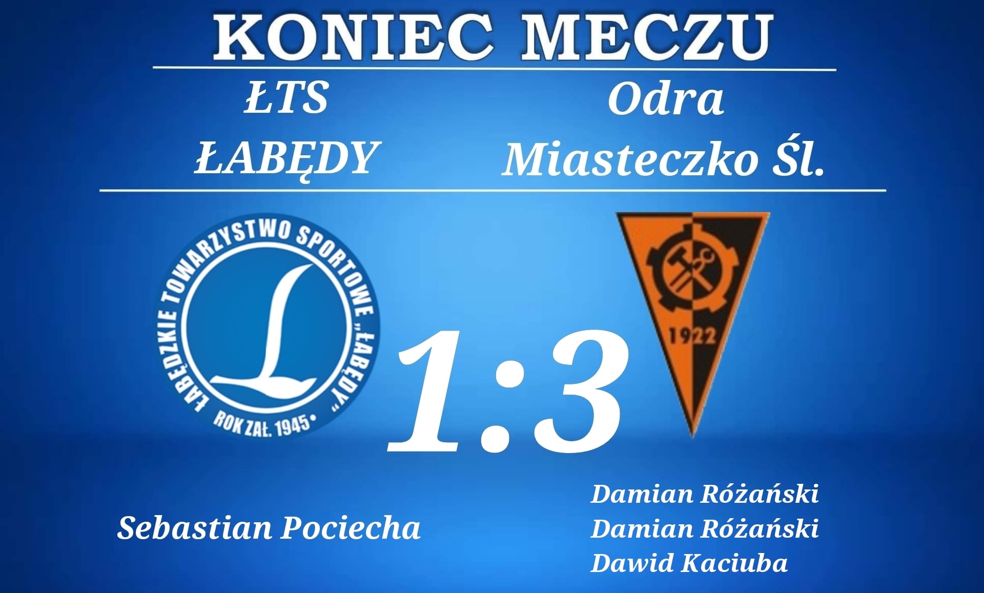 Spotkanie Zakończyło się zwycięstwem drużyny z Miasteczka Śl. 1:3. Honorowe trafienie w Naszej drużynie zdobył Sebastian Pociecha.