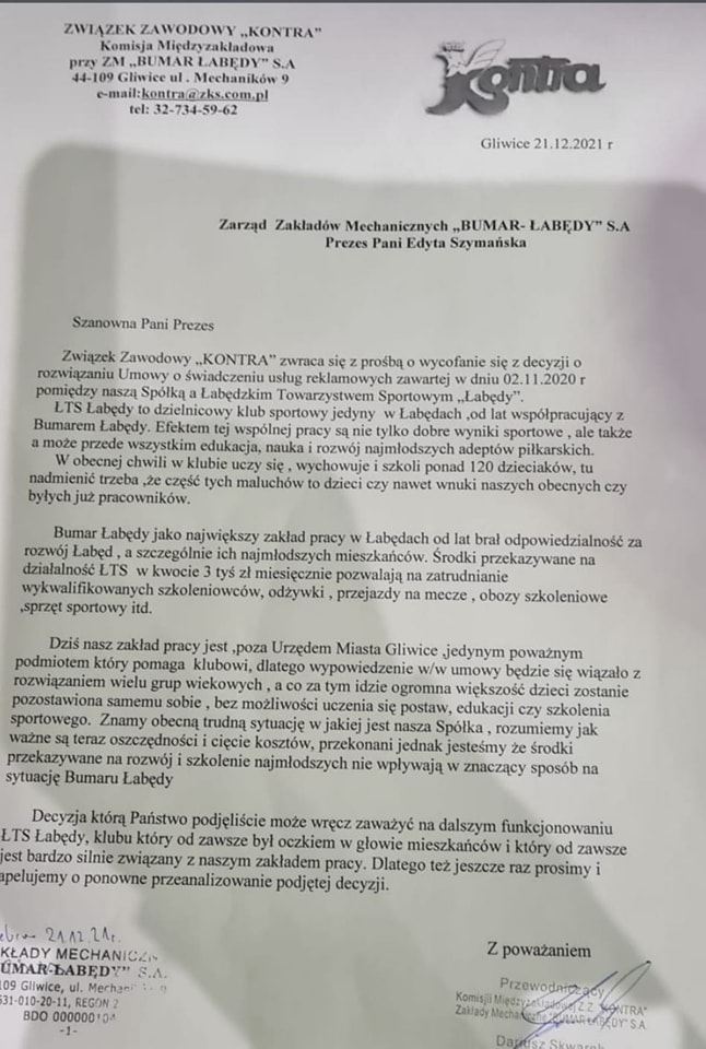Serdeczne podziękowania dla Związku Zawodowego "Kontra", a w szczególności dla Przewodniczącego Związku Pana Dariusza Skwarka za włączenie się w próbę przywrócenia wypowiedzianej z końcem roku przez Bumar Łabędy umowy sponsorskiej na rzecz naszego Klubu, która stawia nasze Stowarzyszenie w bardzo trudnej sytuacji.